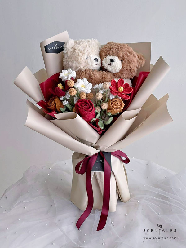 Hugging couple bear x1 pair, crochet maroon tulip x1, crochet maroon rose x1, crochet white baby breath x1, crochet khaki rose x1, crochet light brown rose x1, crochet dark brown rose x1, crochet khaki berry x1, crochet white alstroemeria x1, crochet maroon ge sang x1 and crochet dark brown berry x1